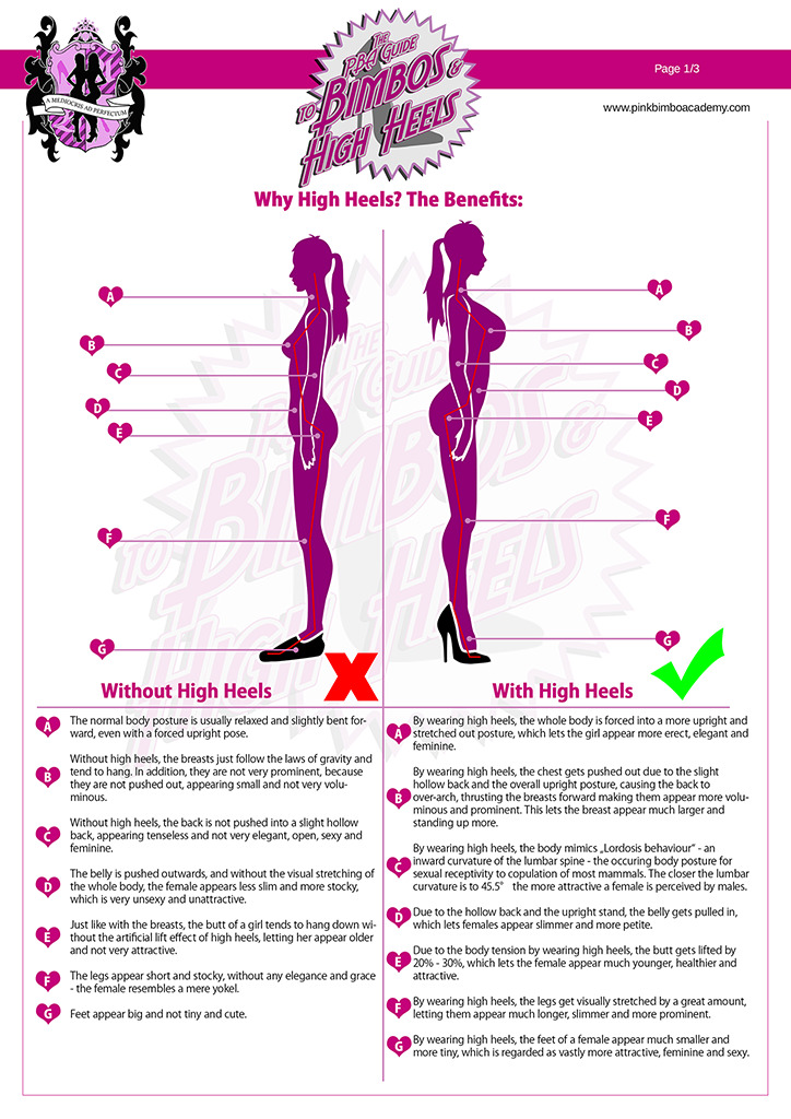 So, the connection is very clear – but something else becomes very apparent: Apart from the ties of high heels and femininity on a meta level, the shoes themselves are an important and distinct element when it comes to style choices of females: Already in the early 80s, a group of scientist discovered, that over 50% of the females on the front covers of pornographic magazines wore nothing else BUT high heels – findings that do not only strengthen the connection of femininity and high heeled shoes and the assumed effect on sex appeal, but also the presumption that high heels alone can be regarded as a “complete style”, an idea that gets support from a survey, in which women were asked if high heeled shoes can be an outfit in themselves – to which 90% of the females answered with “Yes”! Now, that we discovered how important high heels are for femininity, it is no stretch to make the assertion, that high heels are also extremely important when it comes to bimbofication. Overall, bimbofication is all about “hyper femininity”, as we already stated in our very basic articles about the definition of bimbofication and about what makes a bimbo a bimbo – so if high heels play a big role for femininity in general, it is save to assume that they play an even bigger and more important role in bimbofication – and that’s exactly true! This is the reason, why we are starting a new multiple parts series on the Pink Bimbo Academy, dealing with the topic of “Bimbos and High Heels”, in which we try to examine every aspect of this subject. To most of you, this will not be something completely new, regarding how many posts and articles we already had on the PBA dealing with this theme, but all of these will be integrated into this series, so in the end, we will have a complete overview of this topic. Before we continue with the table of content for this series, and – after that, with the introduction to this series, including a little history and the general connections and benefits of high heels and bimbos, there is a very important disclaimer I have to put up first: